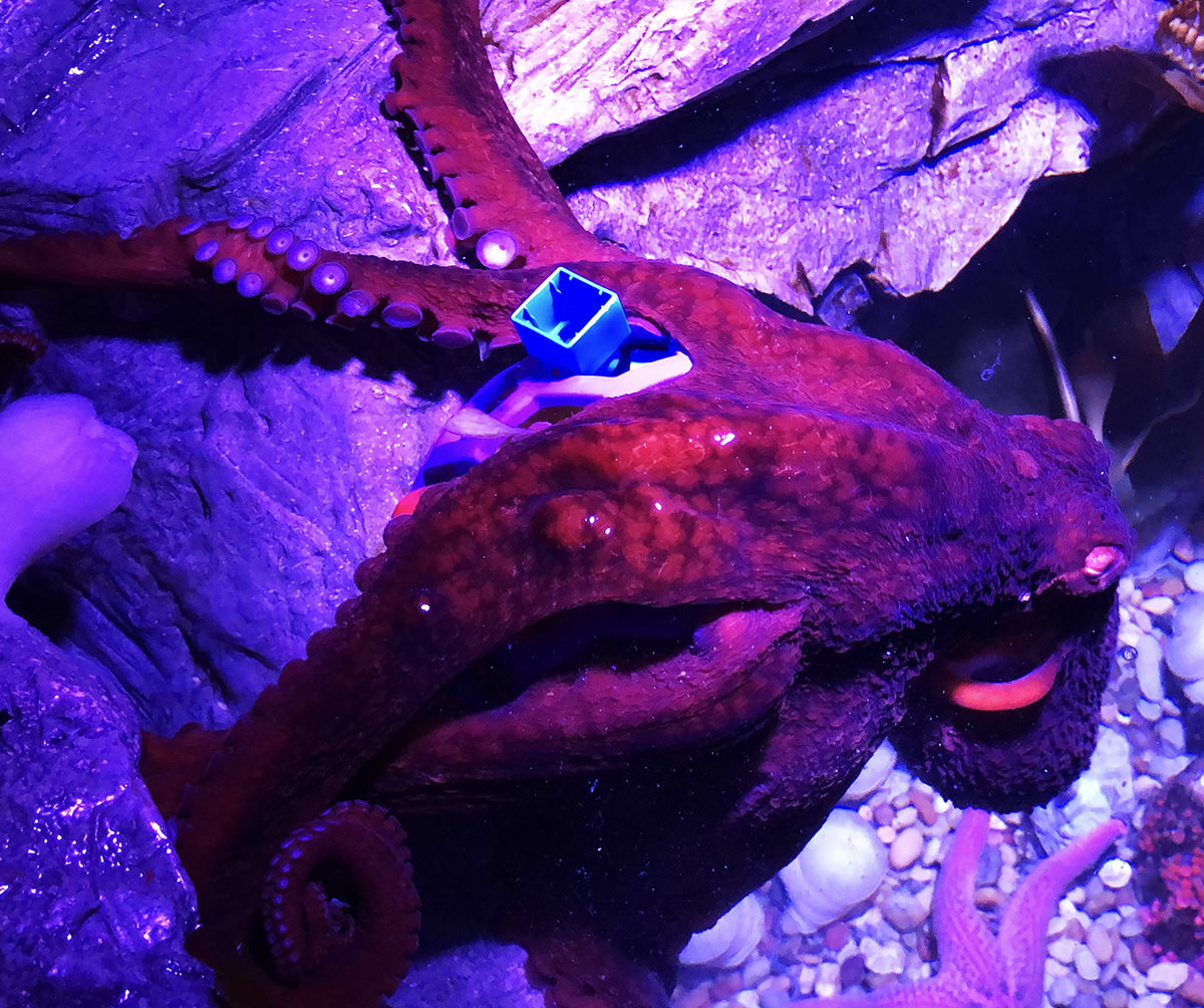 Non avere spina dorsale o esoscheletro ha i suoi vantaggi per un polpo! Questi animali amano strizzarsi in piccoli spazi, quindi metterli in un contenitore o cestino per il trasporto non è estremamente stressante per questo cefalopode se li hai condizionati positivamente. Ho anche scoperto che alcuni dei polpi con cui lavoro tendono a preferire stare in un cesto e spesso li trascineranno nelle loro vasche anche dopo la fine della sessione di addestramento (e come mammifero a due braccia non ho alcuna possibilità contro di loro nel tiro alla fune).