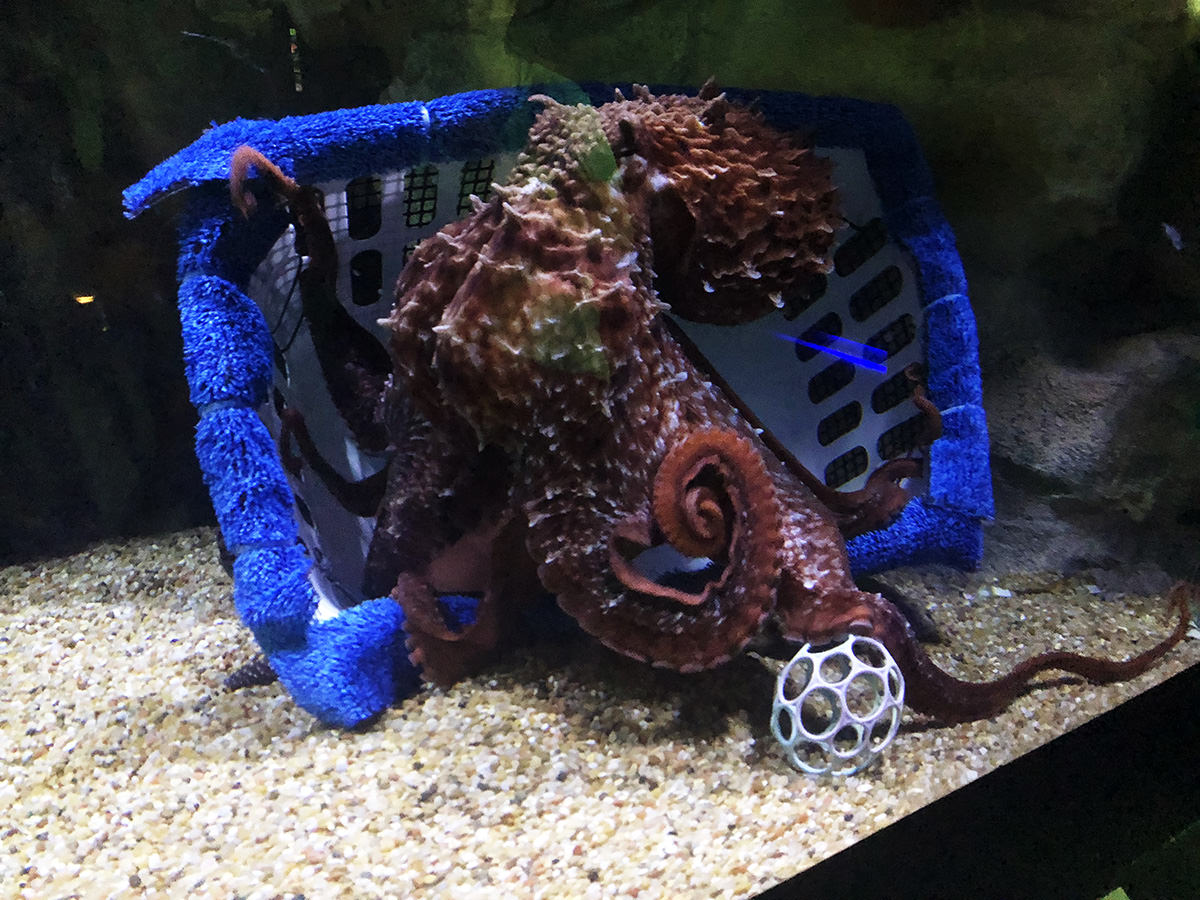 Octopus ha rivendicato il cestino al termine della sessione di addestramento e porta i suoi giocattoli nella nuova "tana".