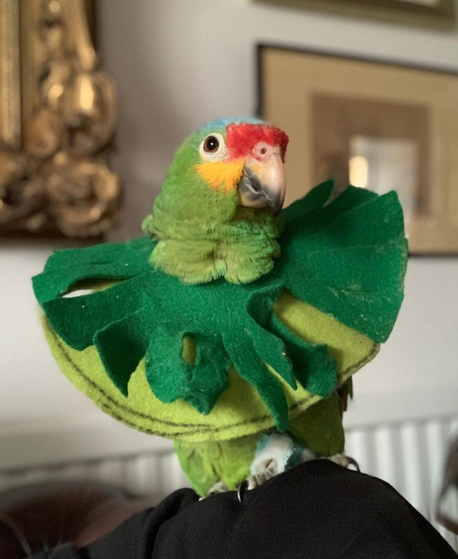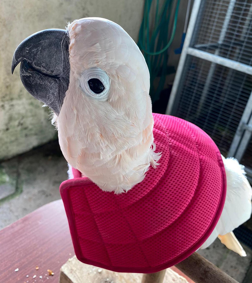 All'inizio di quest'anno il mio pappagallo Peewee, un'amazzone dalla fronte rossa (Amazona autumnalis) ha sviluppato una protuberanza sulla zampa da un fungo che doveva essere rimosso. Dopo l'intervento, Peewee ha dovuto indossare una benda sulla ferita e ha iniziato a strapparla.