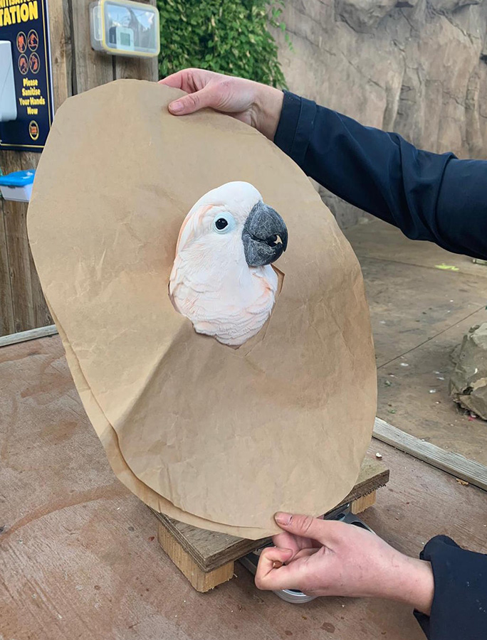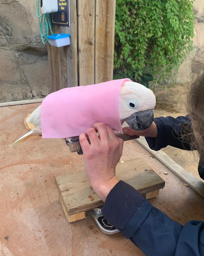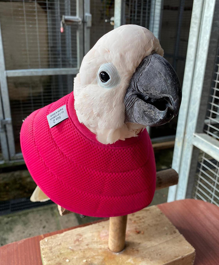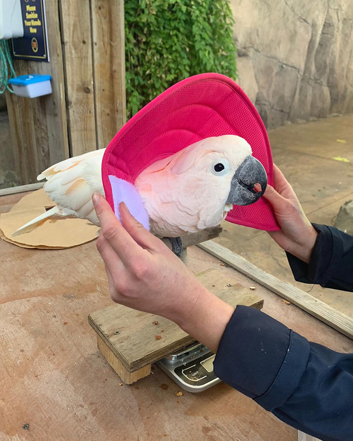 Dato che Peewee non aveva mai avuto alcuna esperienza nell'indossare una collana, a volte sembrava molto frustrato per averla al collo. Ogni volta che era possibile, gli veniva concesso un po 'di tempo libero e supervisionato, ma era necessario che lo indossasse per la maggior parte della giornata. La difficoltà di indossarlo e toglierlo mi ha fatto pensare immediatamente che avrei dovuto addestrare tutti gli uccelli della struttura in preparazione a un comportamento cooperativo simile. In quasi vent'anni di lavoro con gli uccelli, avevo comunque poche conoscenze riguardo questo tipo di intervento chirurgico e le cure che comporta!