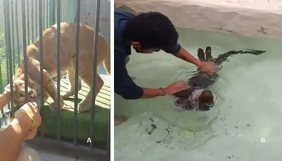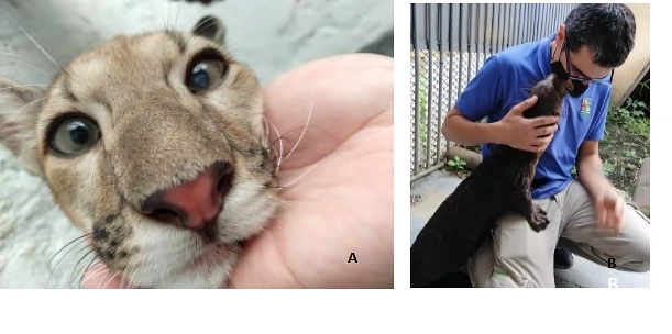 Figura 1: Treinamento para não morder as mãos do cuidador para ter uma melhor abordagem e facilitar os diferentes tipos de cuidados que ele necessita ao longo da vida, A Puma concolor , B Pteronura brasiliensis.
