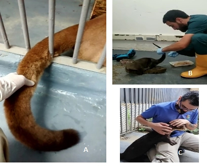 Figura 2: Participação voluntária em diferentes processos de recolha e amostras ou avaliação de seu estado atual. A e B Dessensibilização da cauda para facilitar uma amostra de sangue em Puma concolor e Lontra longicaudis , C Avaliação corporal em Pteronura Brasileiro.