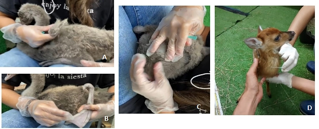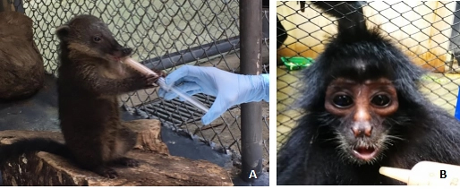 Figura 3: Dessensibilização da seringa aos diferentes sabores que preparam os animais para a administração dos medicamentos, permitindo-lhes colaborar voluntariamente com os diferentes tratamentos e fortalecendo a relação cuidador -animal. A: Nasua nasua , B: Ateles fuscíceps.