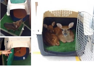 Figura 5: Entrada da caixa de transporte ( guacal ou canil), A e B Pecari tajacu C Odocoileus virginiano.