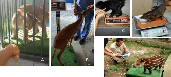 Figura 6: Implementação de pesagem de reforço positivo de um estágio sensível A: Puma concolor , B: Odocoileus virginianus , C: Ateles fusciceps , D: Pecari tajacu , E: Tapirus pitada . Um início sólido para uma história de condicionamento baseada no reforço positivo e numa relação treinador-animal é fundamental no cuidado dos animais.