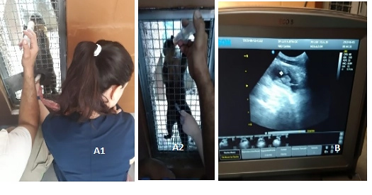 Figura 7: Quatis , treinados para participar voluntariamente de procedimentos de exame físico, como ouvido, olhos e boca, avaliação da condição corporal, medição de temperatura, ausculta, pesagem e ultrassonografia. Animais condicionados comumente parecem confiantes e pacientes, o que facilita esses tipos de procedimentos A1 e A2 exames de diagnóstico por imagem, B Ultrassonografia de Nasua nasua .