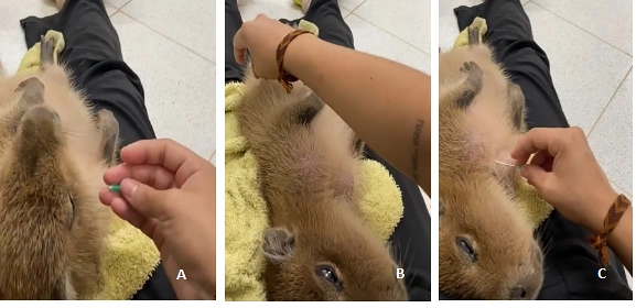 Figura 8: A, B e C Habituação e dessensibilização progressiva ao contato com uma agulha em Chigüiro Hidrocoero hidrochaeris .